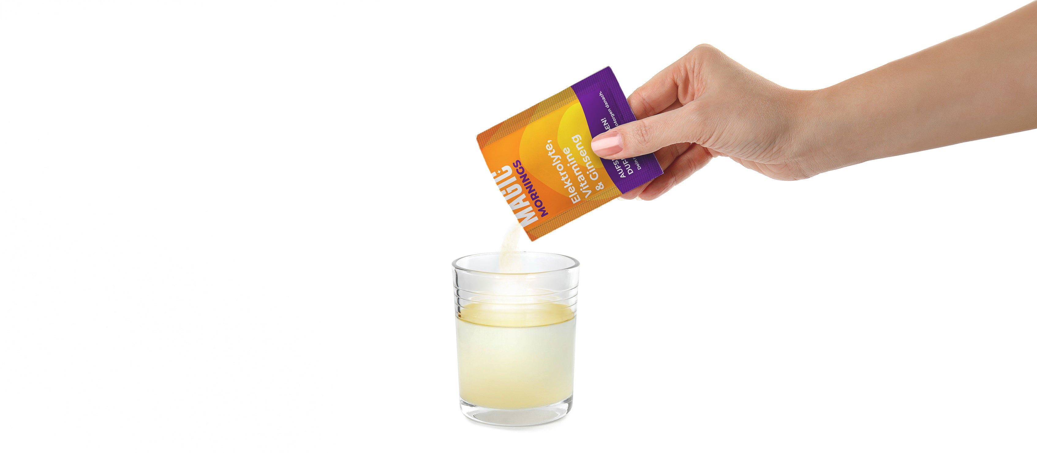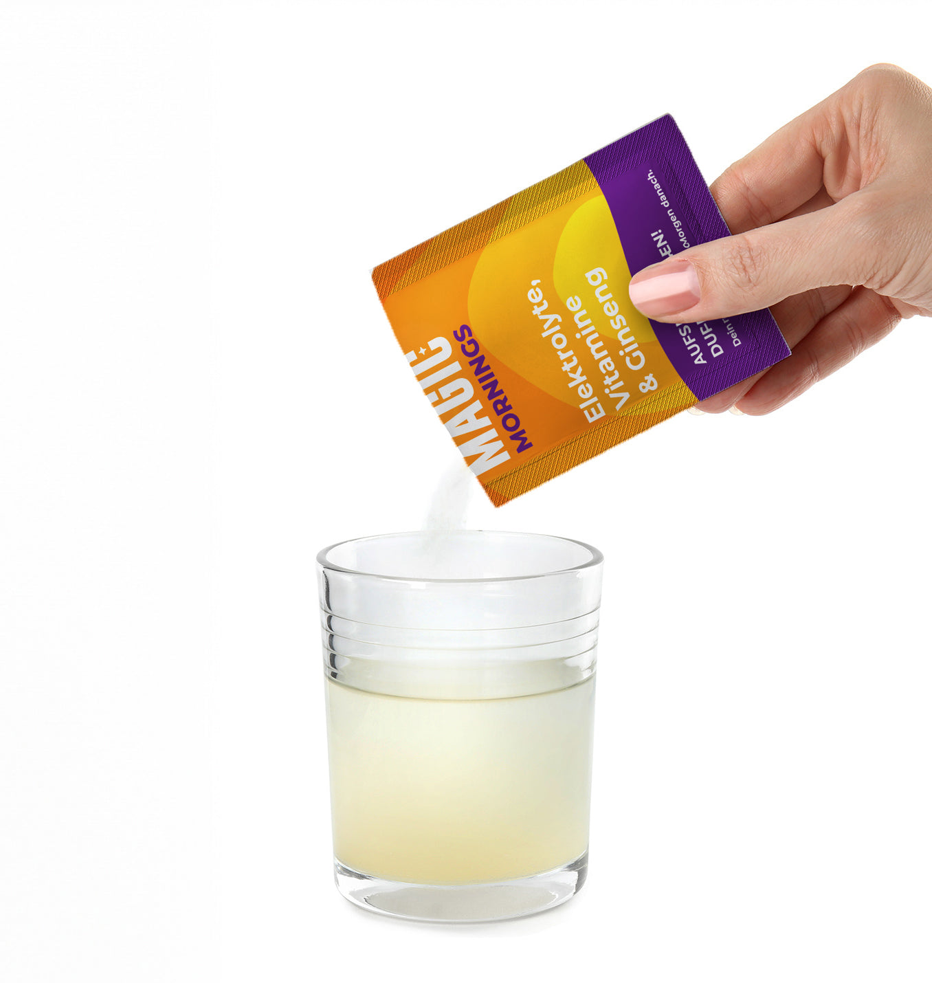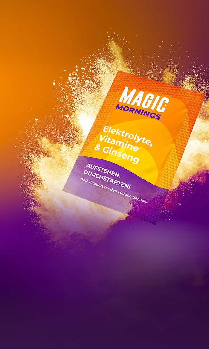 Magic Mornings - your support for the morning after. The optimal support for regeneration. Electrolyte powder with vitamins, minerals & ginseng.